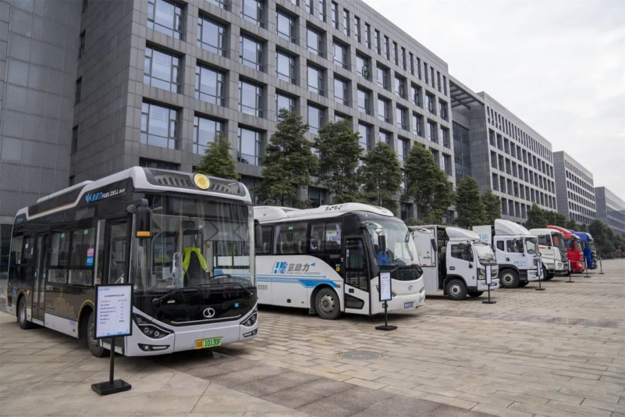 (“成渝氢走廊”启动暨氢燃料电池物流车首发仪式上,搭载东方电气氢燃料电池的商用车,包括公交车、物流车、工程专用车等。)