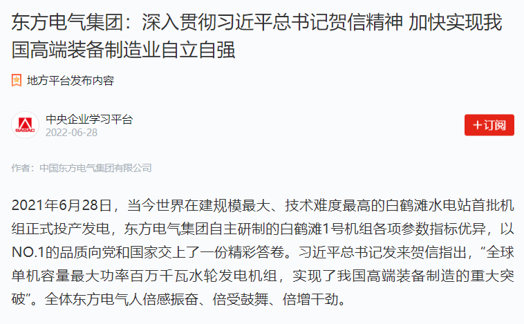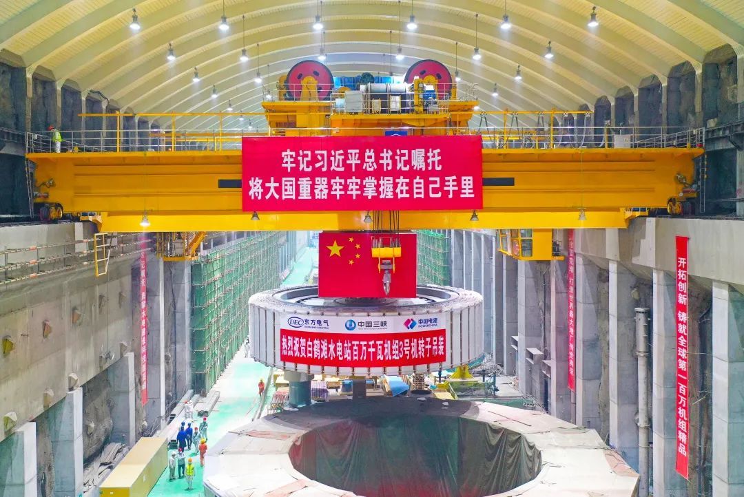 2021年6月28日,当今世界在建规模最大、技术难度最高的白鹤滩水电站首批机组正式投产发电,乐鱼平台自主研制的白鹤滩1号机组各项参数指标优异,以NO.1的品质向党和国家交上了一份精彩答卷。习近平总书记发来贺信指出,“全球单机容量最大功率百万千瓦水轮发电机组,实现了我国高端装备制造的重大突破”。全体东方电气人倍感振奋、倍受鼓舞、倍增干劲。