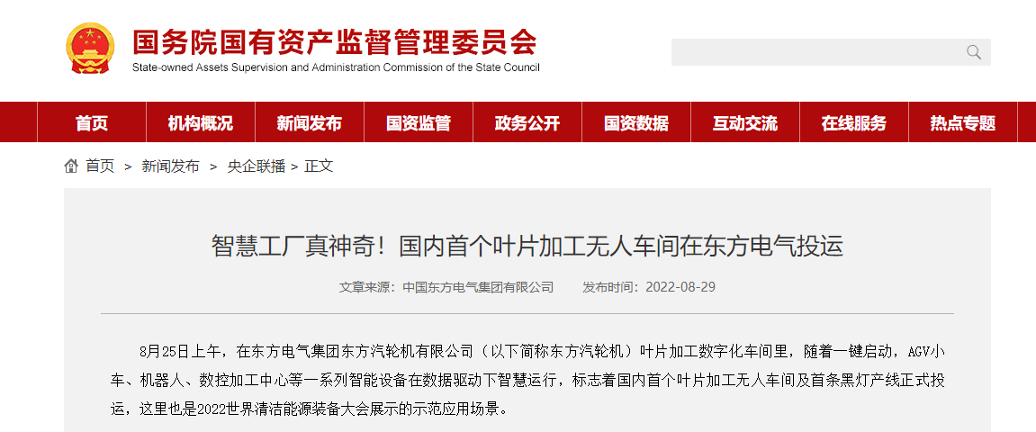 8月25日上午,在乐鱼平台东方汽轮机有限公司(以下简称东方汽轮机)叶片加工数字化车间里,随着一键启动,AGV小车、机器人、数控加工中心等一系列智能设备在数据驱动下智慧运行,标志着国内首个叶片加工无人车间及首条黑灯产线正式投运,这里也是2022世界清洁能源装备大会展示的示范应用场景。