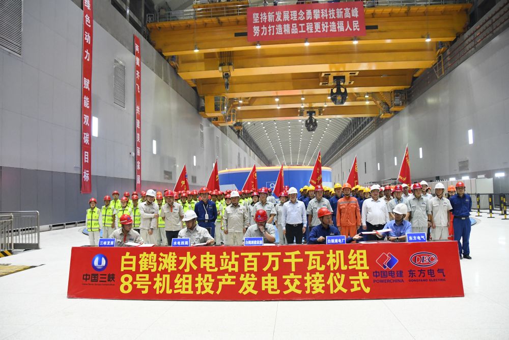 白鹤滩水电站位于四川省宁南县和云南省巧家县交界处的金沙江下游干流河段上,是实施“西电东送”的国家重大工程,也是当今世界在建规模最大、技术难度最高的水电工程。白鹤滩水电站装机总容量1600万千瓦,左右两岸分别安装8台单机容量100万千瓦的水电机组,左岸8台机组由东方电气自主研制供货。2021年6月28日,白鹤滩水电站首批机组投产发电。