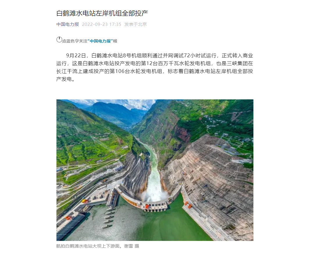 [中国电力报]白鹤滩水电站左岸机组全部投产