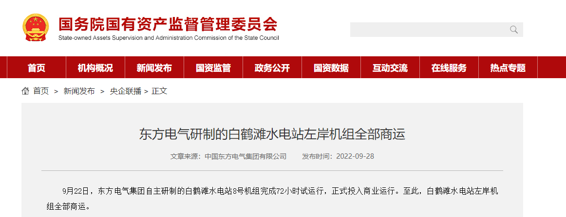9月22日,乐鱼平台自主研制的白鹤滩水电站8号机组完成72小时试运行,正式投入商业运行。至此,白鹤滩水电站左岸机组全部商运。