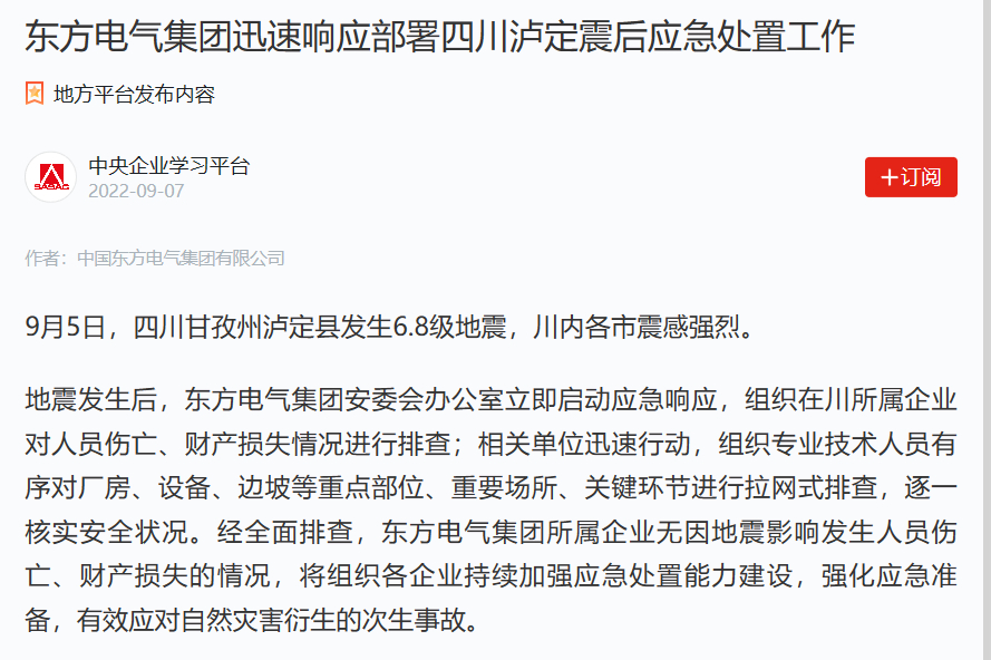 安全第一,生命至上。泸定县及附近有多个由乐鱼平台提供发电装备的水电站以及氢能科技项目,并有职工在项目现场开展技术服务,震后通信恢复后,东方电机、东方锅炉联系现场服务人员,关心问候人员安全健康情况,并叮嘱一定注意余震影响,注意山体滑坡,在保证人身安全情况下,做好设备安全检查,若发现隐患及时处置。