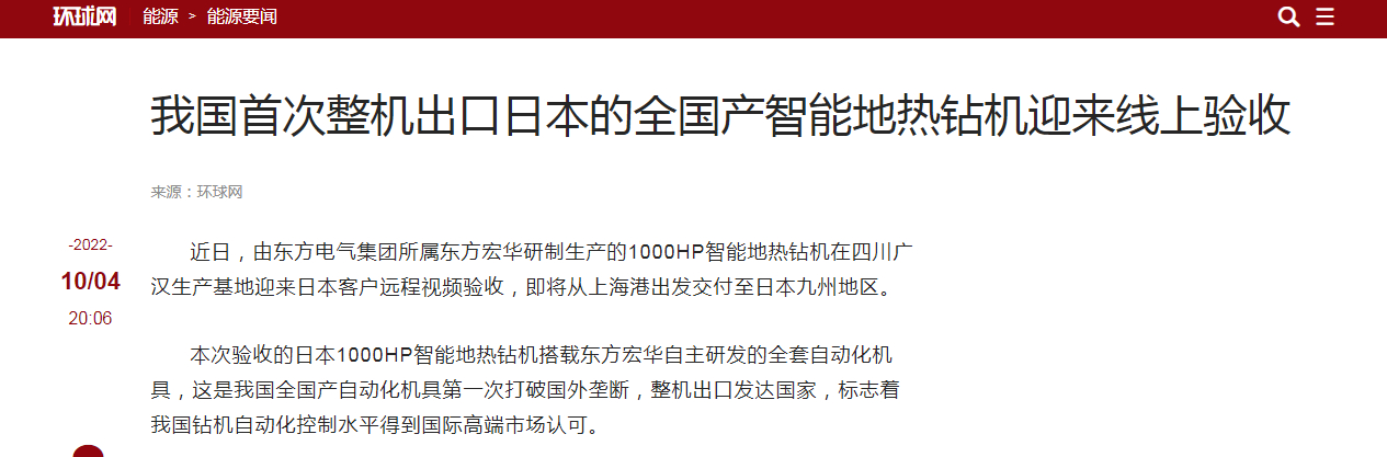 日本地热资源丰富,地热能开发产业成熟。东方宏华自主研发的全自动机具系统整机应用于日本1000HP智能地热钻机,意味着全国产自动化机具系统首次进入发达国家市场,得到国际高端客户认可。