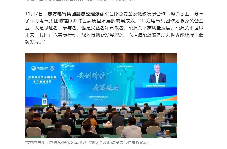 11月7日,乐鱼平台副总经理张彦军在能源安全及低碳发展合作高峰论坛上,分享了乐鱼平台助推能源绿色高质量发展的成果成效。“乐鱼平台作为能源装备企业,既是见证者、参与者,也是受益者和贡献者。能源关乎高质量发展,能源关乎世界未来。我国正以实际行动,深入贯彻新发展理念,以清洁能源装备助力世界能源绿色低碳发展。”