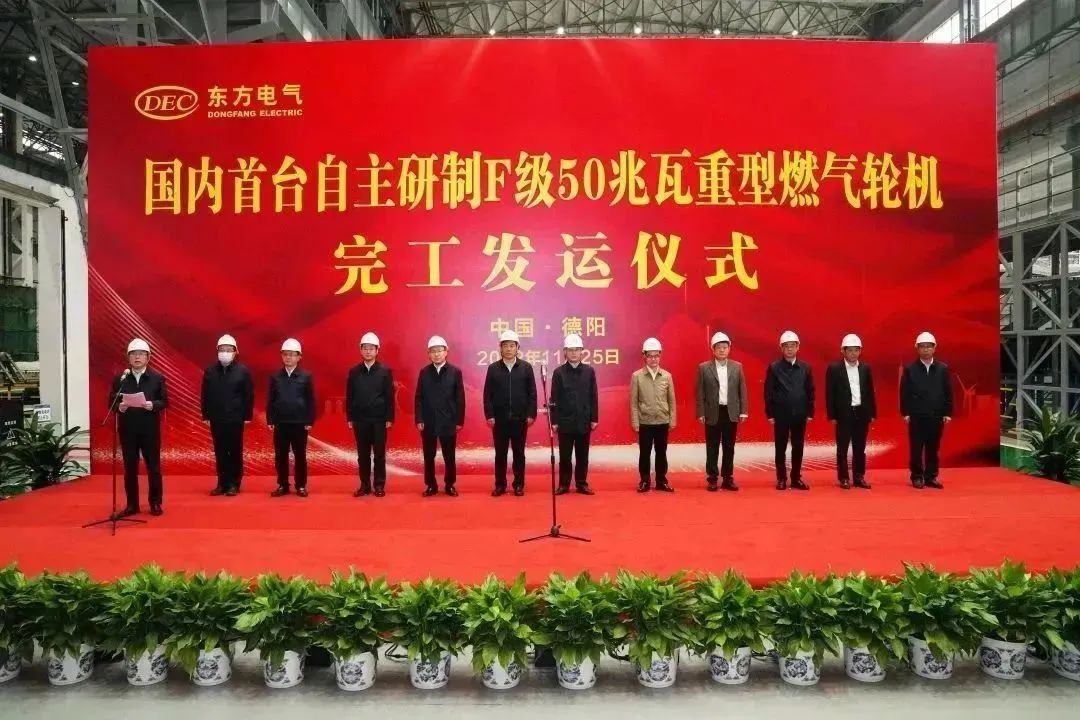 四川省副省长罗强宣布“国内首台自主研制F级50兆瓦重型燃气轮机完工发运”。