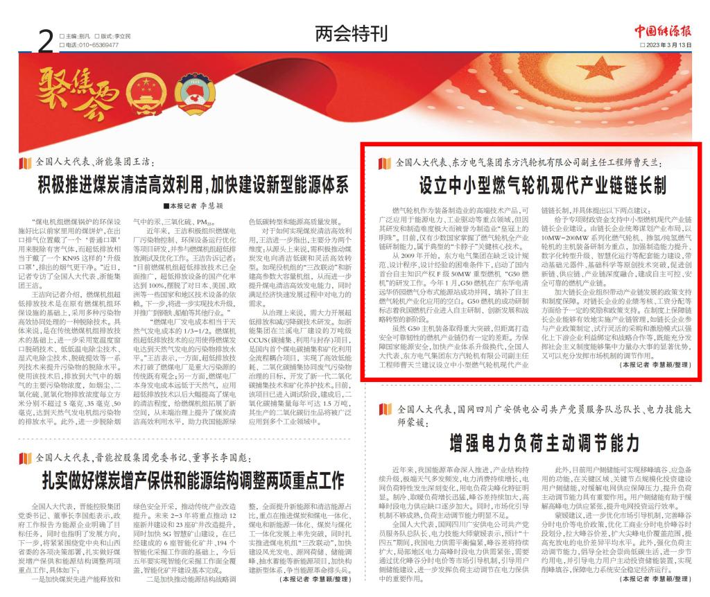 [中国能源报]全国人大代表曹天兰:设立中小型燃气轮机现代产业链链长制