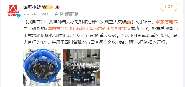 [国资小新]我国首台!我国冲击式水轮机核心部件实现重大突破