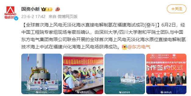 [国资小新]全球首次海上风电无淡化海水直接电解制氢在福建海试成功