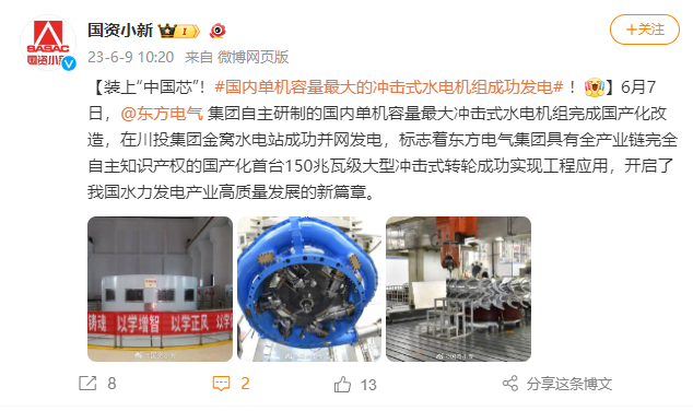 [国资小新]装上“中国芯”!#国内单机容量最大的冲击式水电机组成功发电#