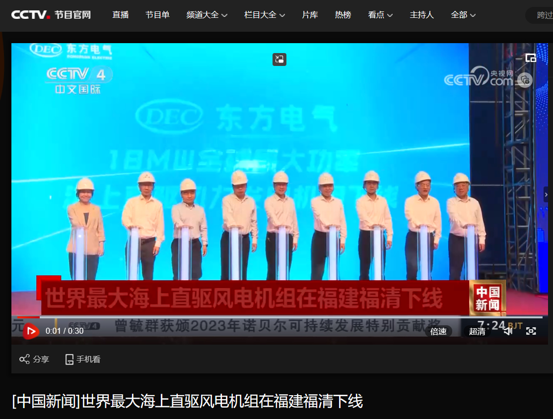 [央视中国新闻]世界最大海上直驱风电机组在福建福清下线