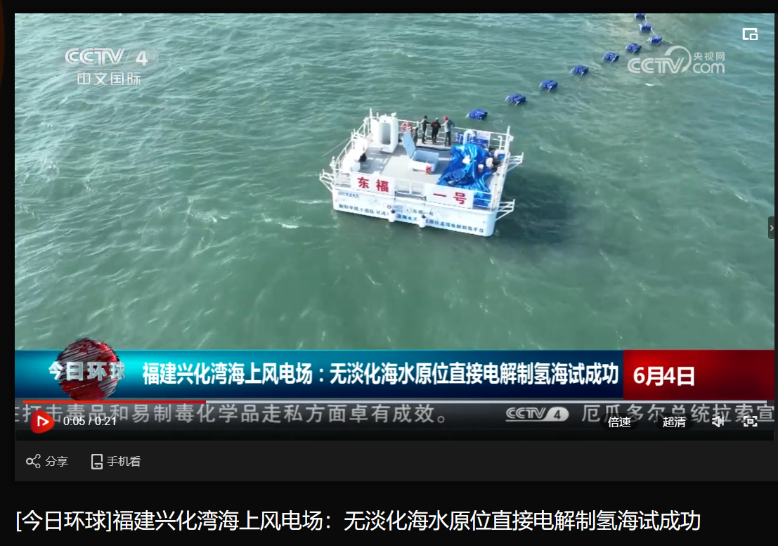 [央视今日环球]福建兴化湾海上风电场:无淡化海水原位直接电解制氢海试成功