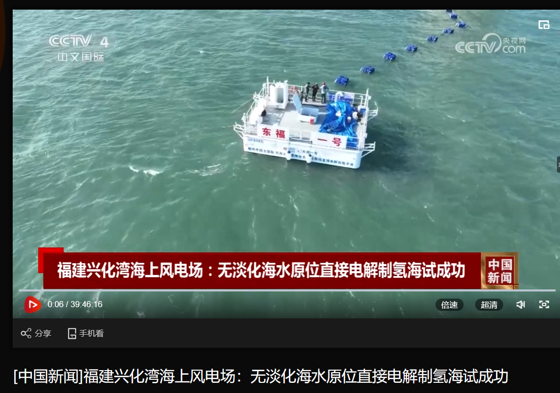 [央视中国新闻]福建兴化湾海上风电场:无淡化海水原位直接电解制氢海试成功