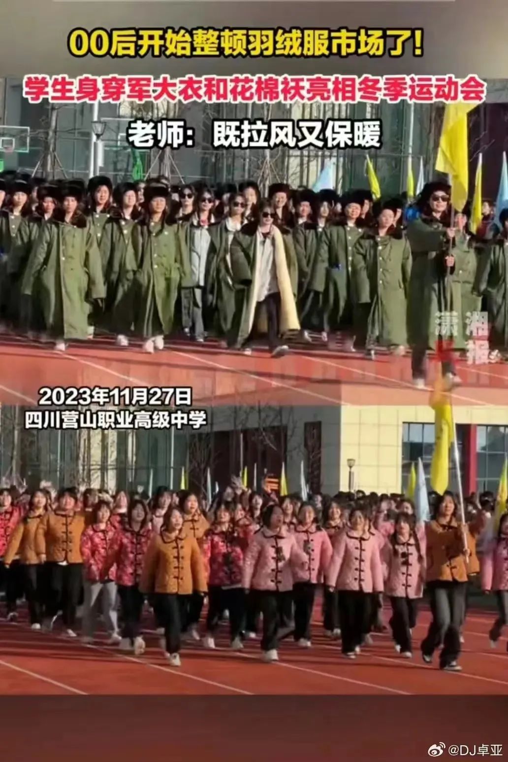 一排排大学生裹着军大衣、穿着花棉袄