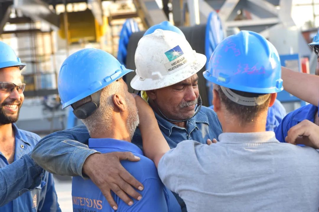 在首套钻机成功下线时,激动不已的埃及雇员们,在这套钻机下互相拥抱、合影。互相托举庆祝的他们,脸上有笑容,也有泪光。