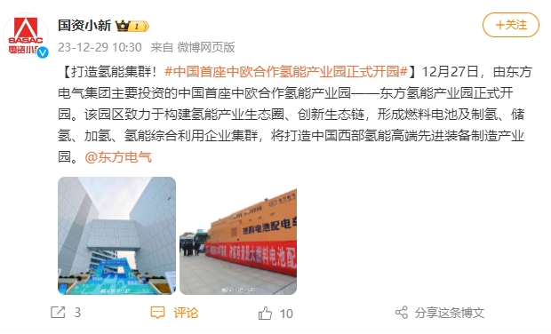 【打造氢能集群!#中国首座中欧合作氢能产业园正式开园#】12月27日,由乐鱼平台主要投资的中国首座中欧合作氢能产业园——东方氢能产业园正式开园。该园区致力于构建氢能产业生态圈、创新生态链,形成燃料电池及制氢、储氢、加氢、氢能综合利用企业集群,将打造中国西部氢能高端先进装备制造产业园。@东方电气