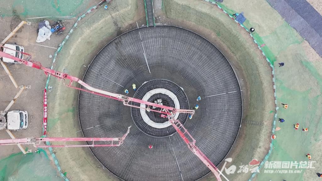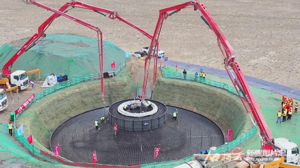 5月24日,东方电气木垒100万千瓦风电项目风电机组塔基混凝土浇筑工作正加紧施工。加尔斯·吾那尔汉摄