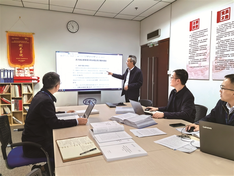图为乐鱼平台供应商管理专项治理综合组工作人员正在进行专项研讨。 乐鱼平台纪检监察组供图