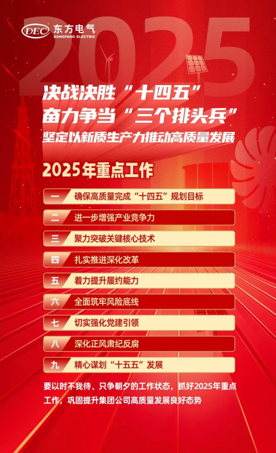 1月18日,东方风电召开2025年度工作会议暨二届八次职工代表大会,传达集团公司2025年度工作会议精神。会议要求,全体干部职工认真落实中央经济工作会议决策部署和集团公司年度工作会议要求,准确把握新时代新征程央企新使命、新定位,动员和带领广大干部职工锚定2025年公司各项目标任务,团结奋斗,助力企业高质量发展。
