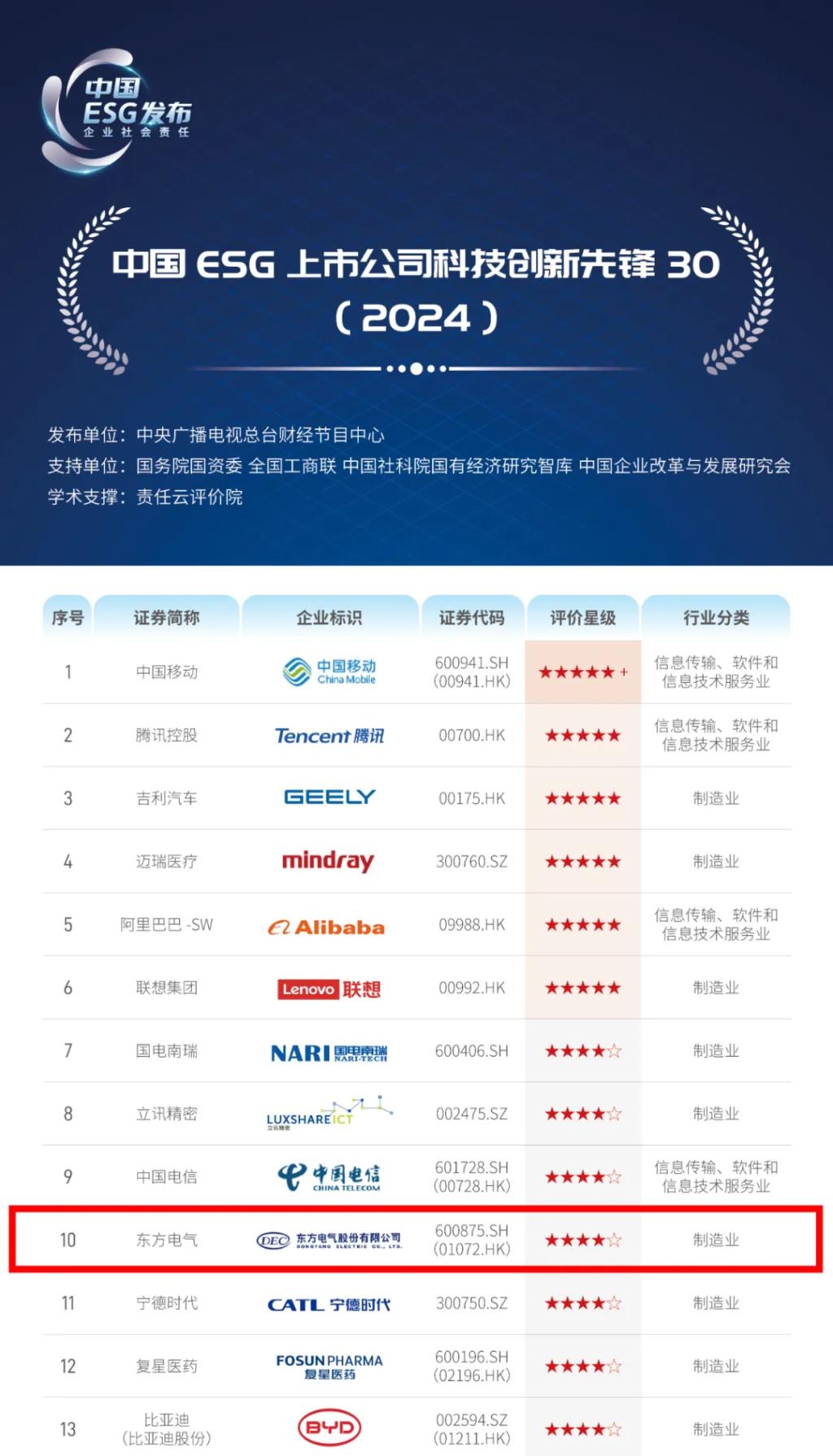 近日,由中央广播电视总台联合国务院国资委、全国工商联、中国社科院国有经济研究智库、中国企业改革与发展研究会等权威机构联合推出的《科技创新ESG行动报告(2024)》正式发布。东方电气凭借在科技创新和ESG(环境、社会和公司治理)领域的卓越表现,成功入选“中国ESG上市公司科技创新先锋30(2024)”榜单,位列榜单第十位。