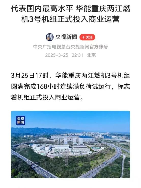 近日,央视新闻以《代表国内最高水平华能重庆两江燃机3号机组正式投入商业运营》为题,报道了由东方电气供货的华能重庆两江燃机3号机组。经试验验证,该机组性能指标优于设计标准,圆满完成168小时连续满负荷试运行,正式投入商运。