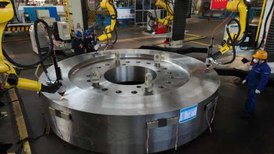 为应对冲击式机组运行的复杂工况,提高转轮焊接质量,东方电机积极探索自动化、智能化焊接技术,通过三维模拟、工装设计,克服了强约束空间焊接干涉难题,实现了狭小空间内机器人轨迹规划。通过大量焊接试验,形成了冲击式转轮焊接数据库,开发了专用离线编程软件,实现了大幅度截面变化的焊道排布、多曲面变化的焊缝成型。此外,还采用了5G网络多机器人集成控制技术,实现了智能传感、动态纠偏,提高了焊接效率和稳定性;采用数字孪生技术,实现焊接过程远程监控。