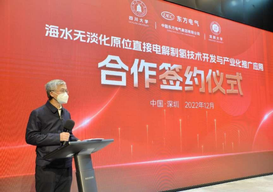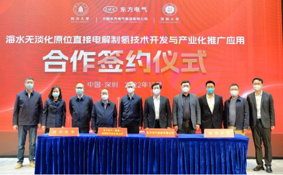 本网讯  12月16日,中国工程院院士谢和平领衔指导的四川大学、深圳大学博士团队与东方电气股份有限公司、东方电气(福建)创新研究院有限公司在深圳签署“海水无淡化原位直接电解制氢原创技术中试和产业化推广应用”的四方合作协议。中国工程院院士谢和平,乐鱼平台党组成员、副总经理张彦军,深圳大学副校长汪永成等出席签约仪式。