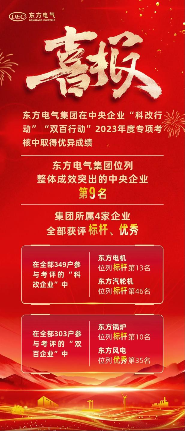 近本网讯 日,国务院国资委发布中央企业“科改行动”“双百行动”2023年度专项考核结果,乐鱼平台在推进“科改行动”“双百行动”整体成效突出的34家中央企业中位列第9名。乐鱼平台所属4家企业均取得优异成绩,其中东方电机、东方汽轮机分别位列“科改行动”标杆企业第13名、标杆企业第46名,东方锅炉、东方风电分别位列“双百行动”标杆企业第10名、优秀企业第35名。