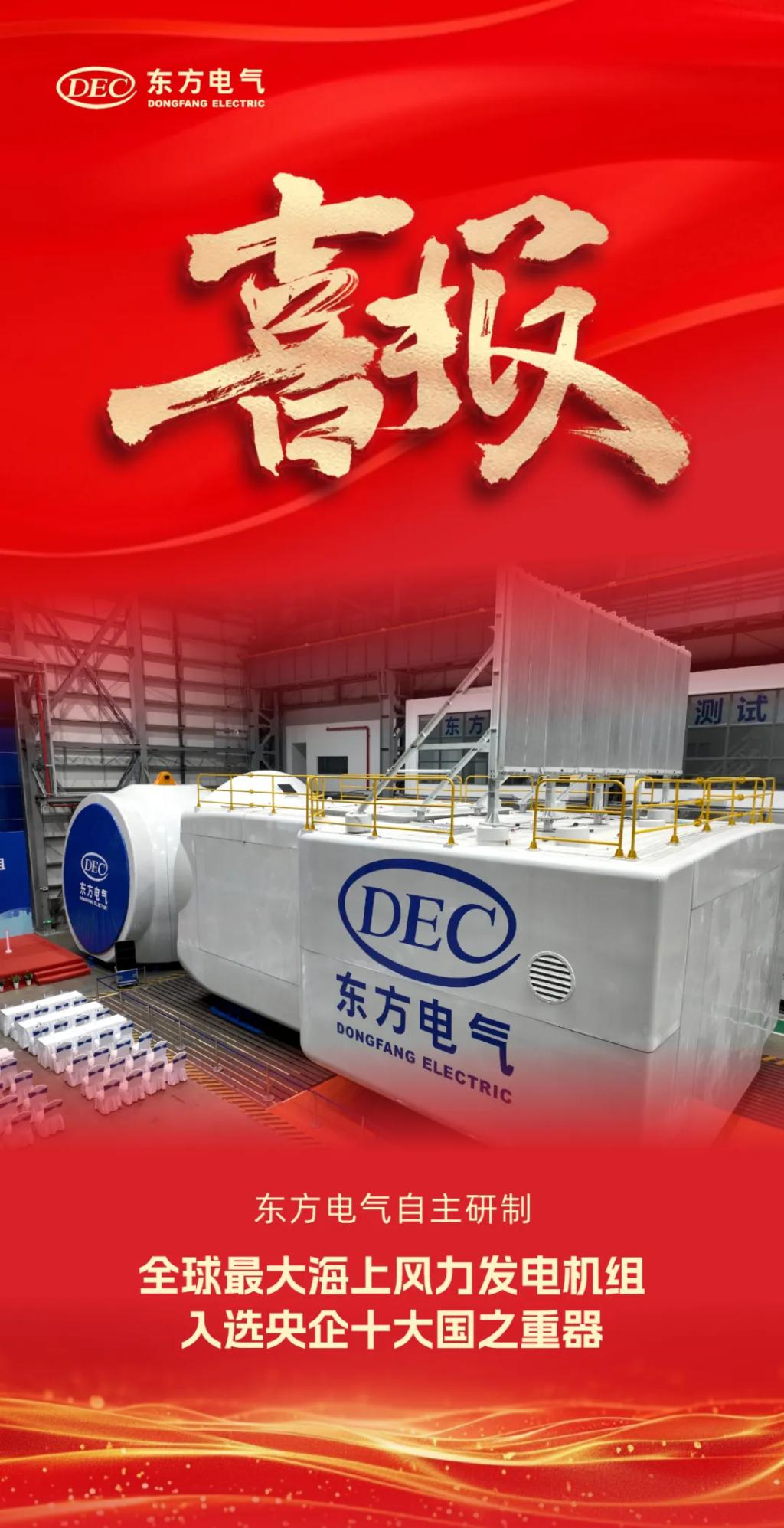 1月1日,国务院国资委新闻中心正式发布2024年度央企十大国之重器,由东方电气研制的“全球最大海上风力发电机组”成功入选继“全新一代18兆瓦海上直驱风电机组”后,东方电气海上风电产品再次入选央企十大国之重器。